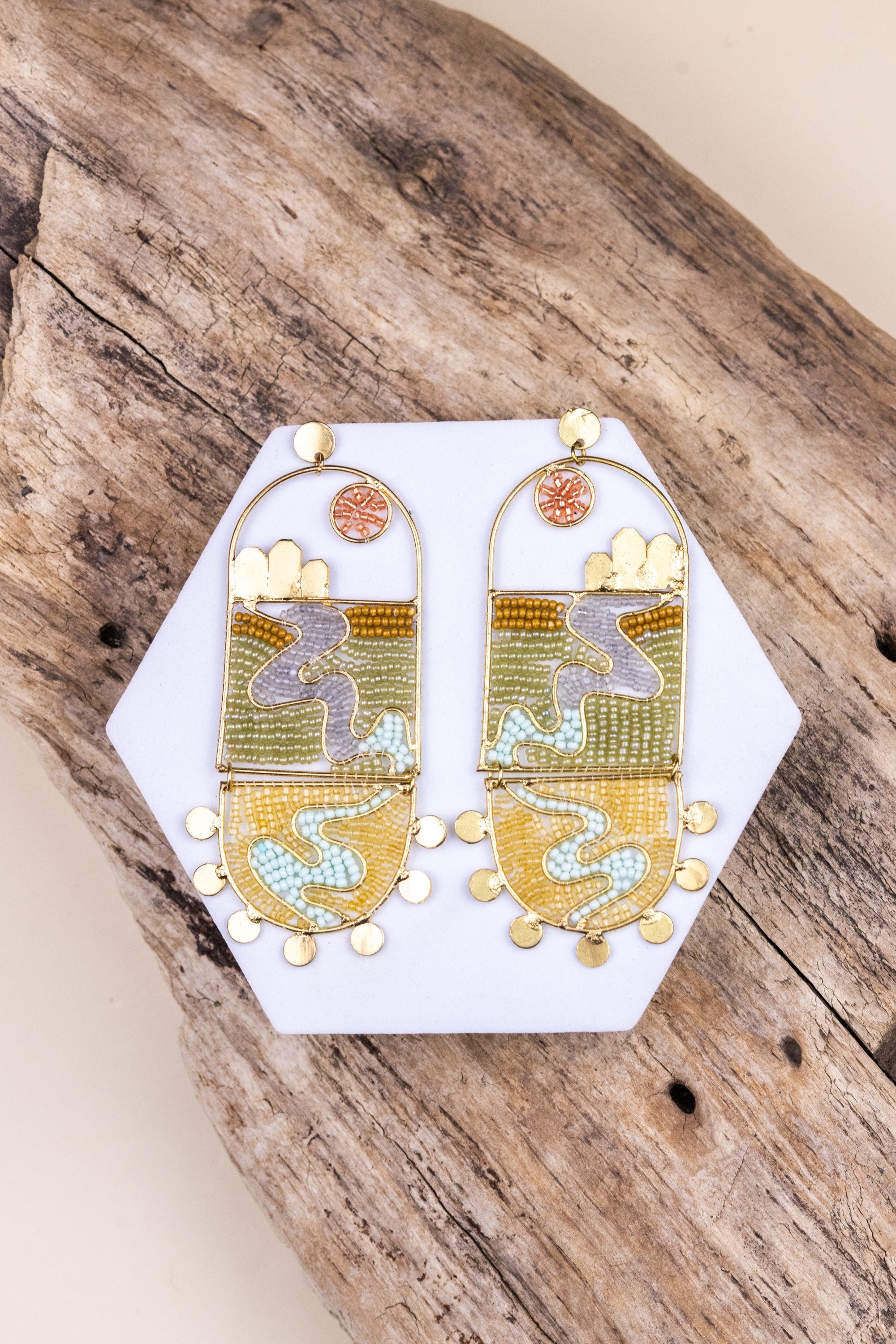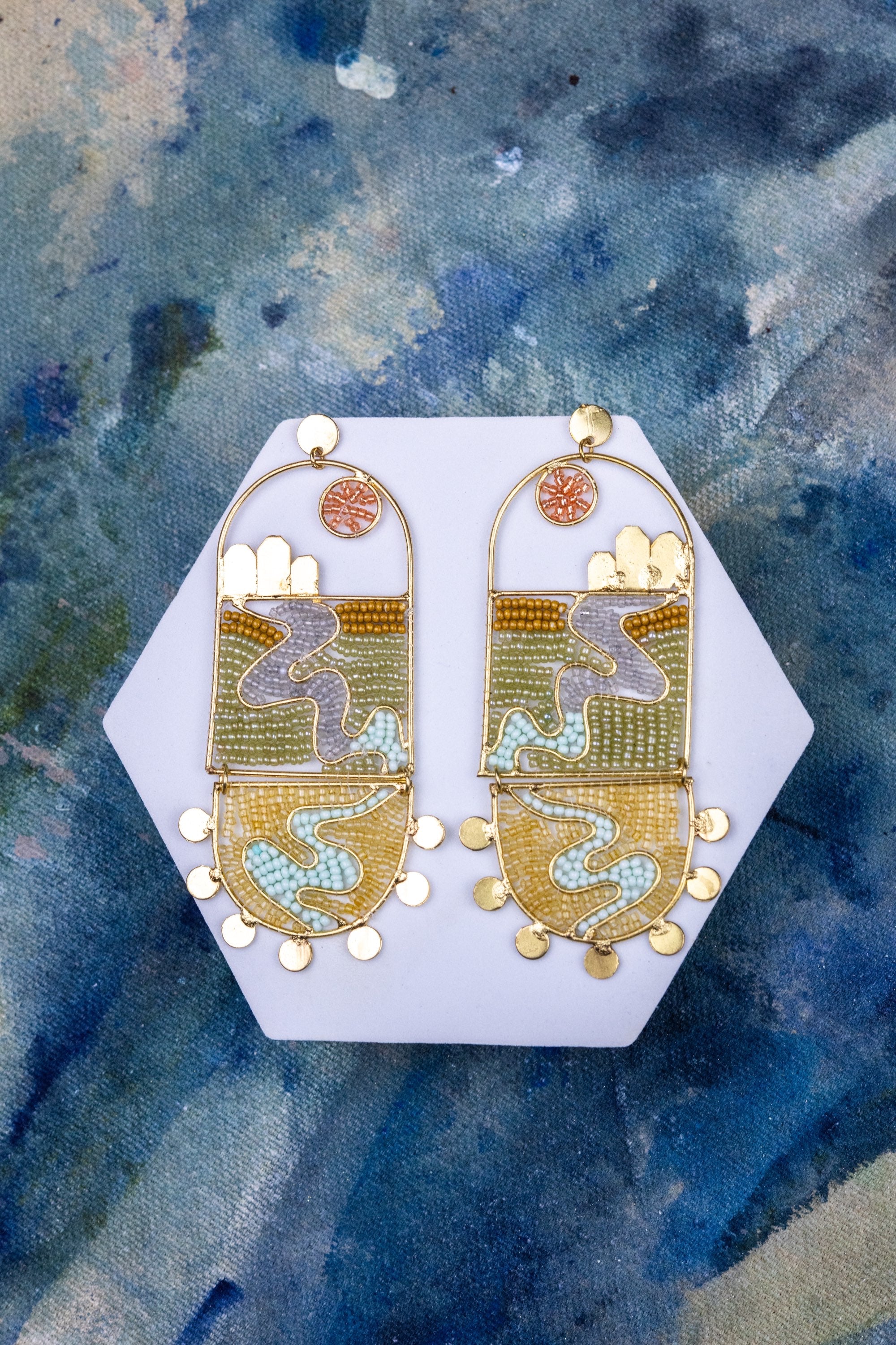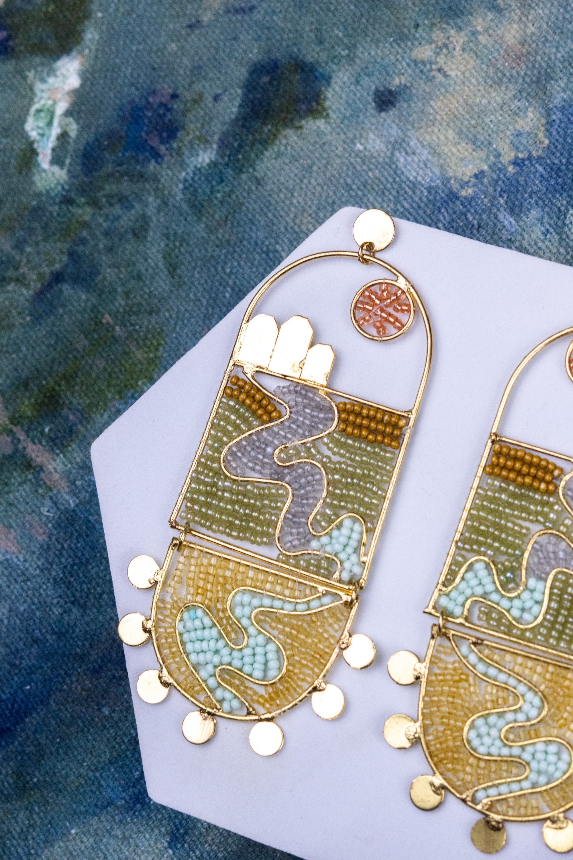 Thread has a natural memory. When not being worn, earrings should be hung or laid flat to support their intended form over time. When traveling, it is recommended to store earrings separately from other jewelry to help prevent surface contact, scratching, or snagging of the beadwork. Thoughtful storage helps maintain both shape and finish with wear.