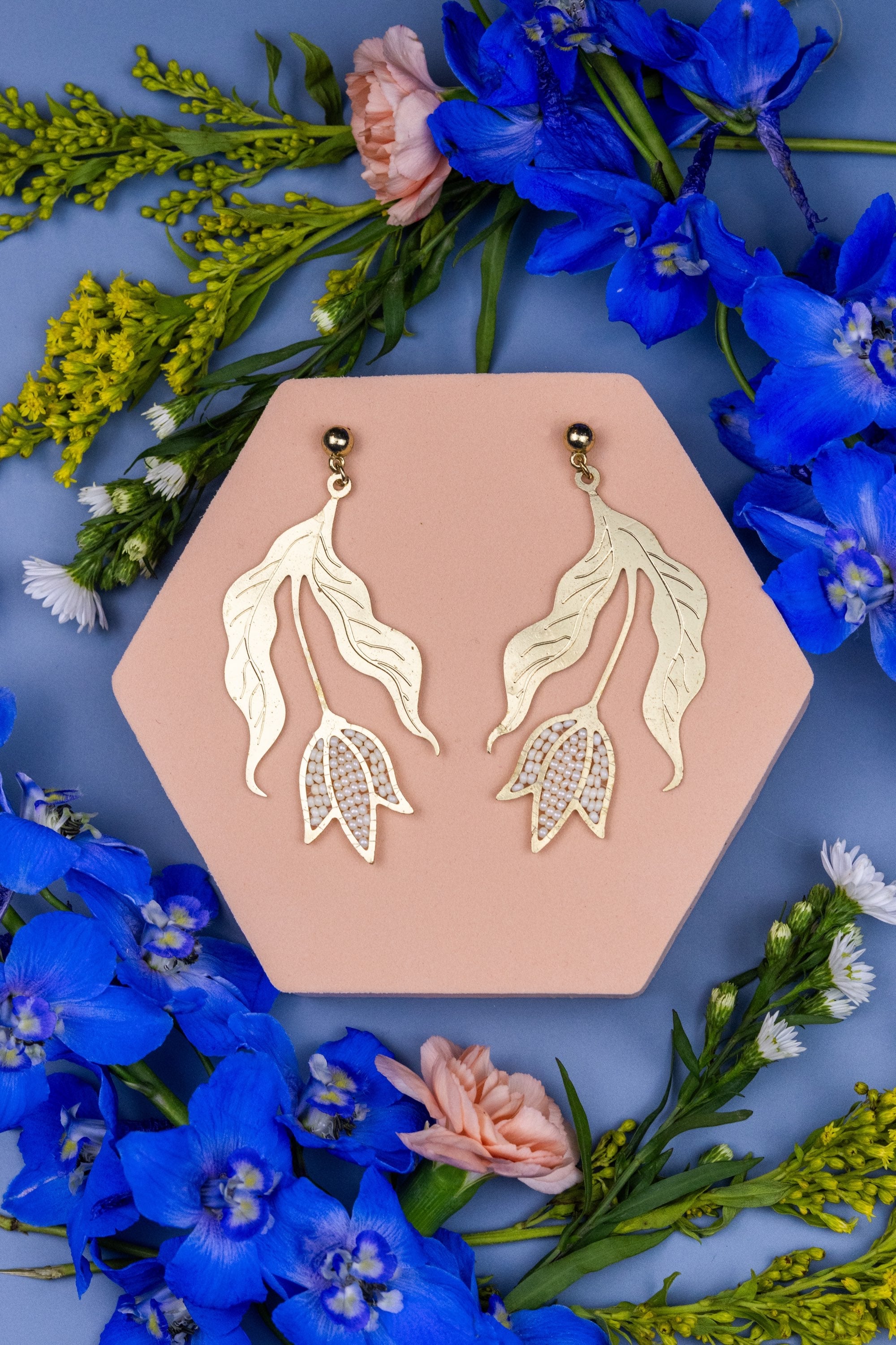 Delicately crafted with a blend of beads and metal, each earring portrays the timeless beauty of tulips in a mesmerizing dance of color and form. The meticulous detailing captures the essence of blooming petals, bringing the spirit of a tulip garden to life. Adorn your ears with this floral masterpiece, a harmonious fusion of nature-inspired design and artisanal grace.