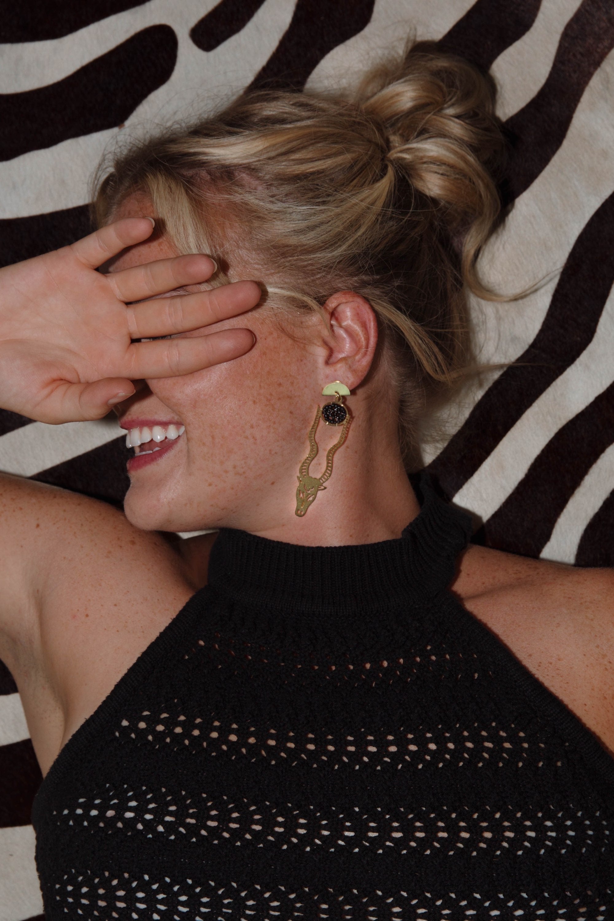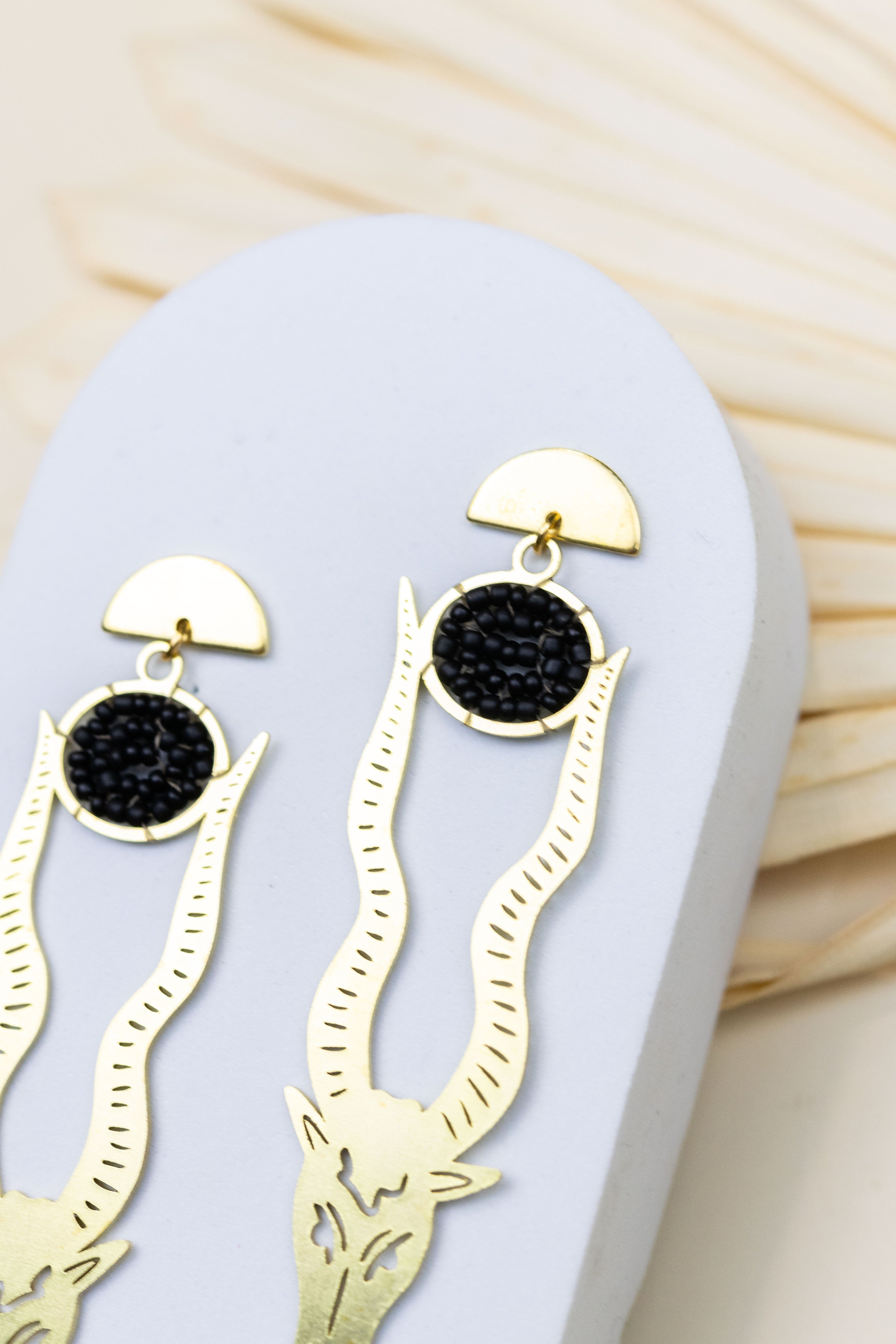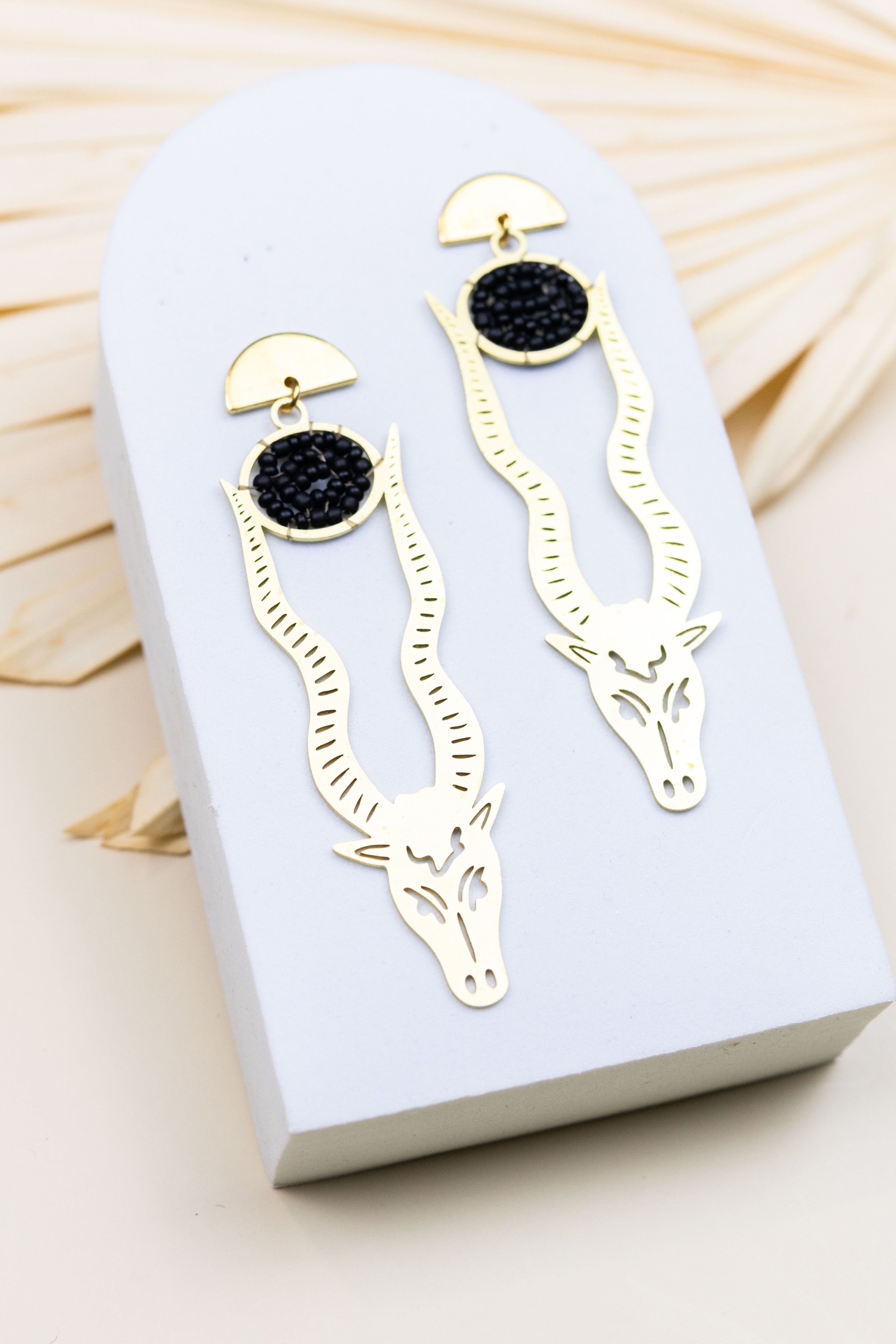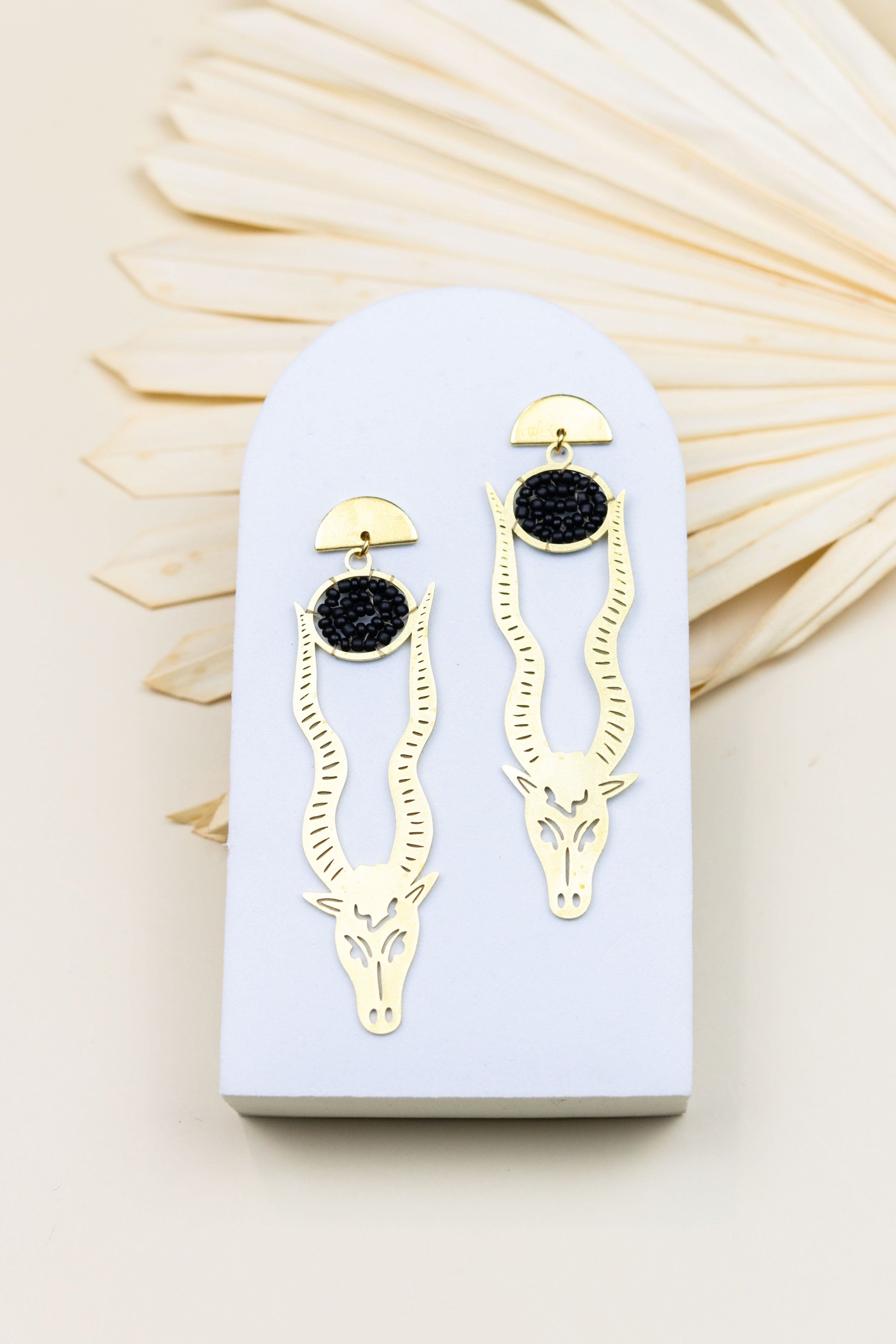 These earrings feature a graceful Oryx motif, capturing the spirit of the savannah in a stunning statement. Atop each horn rests a bead black sun, adding a touch of mystical allure to the elegant silhouette.