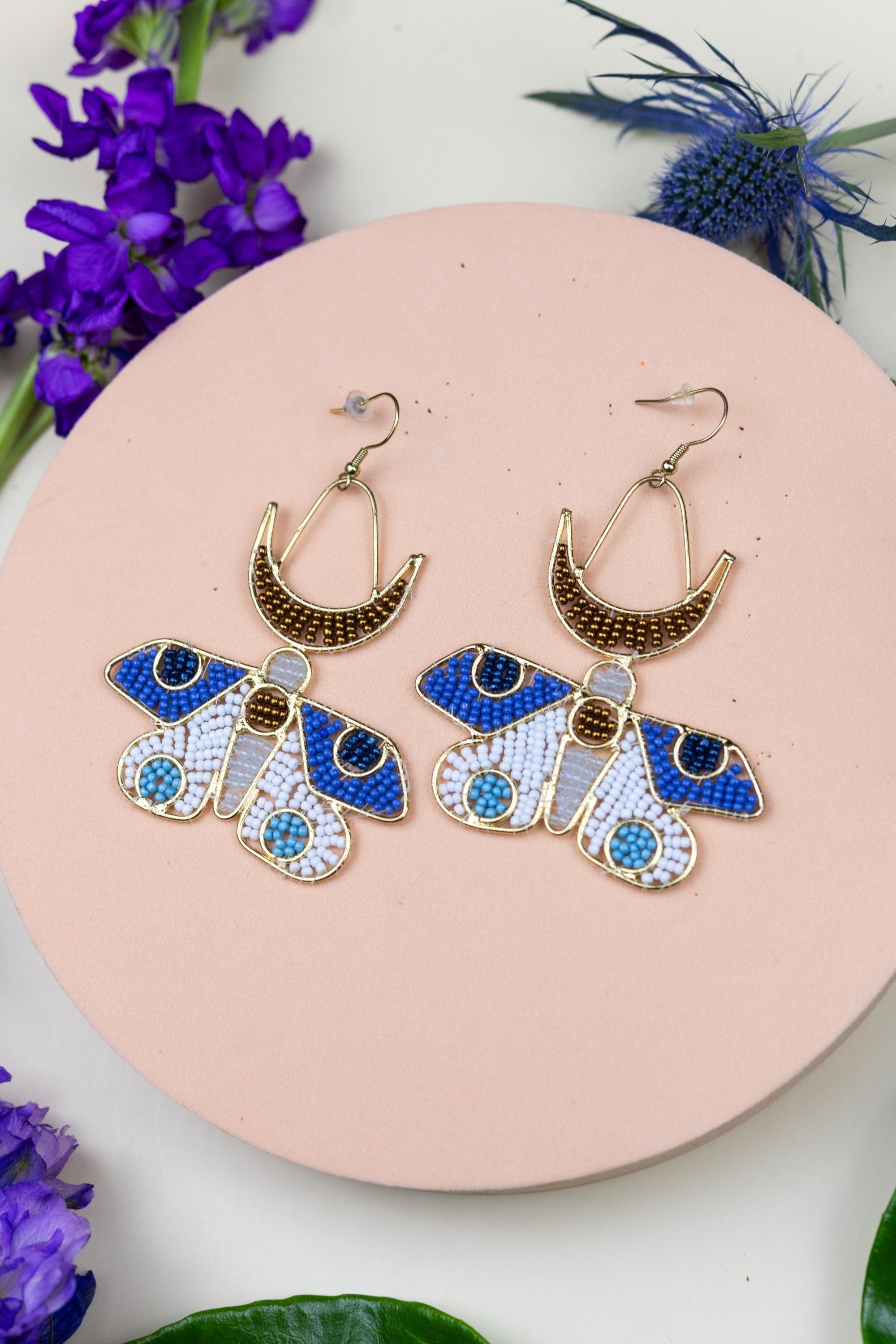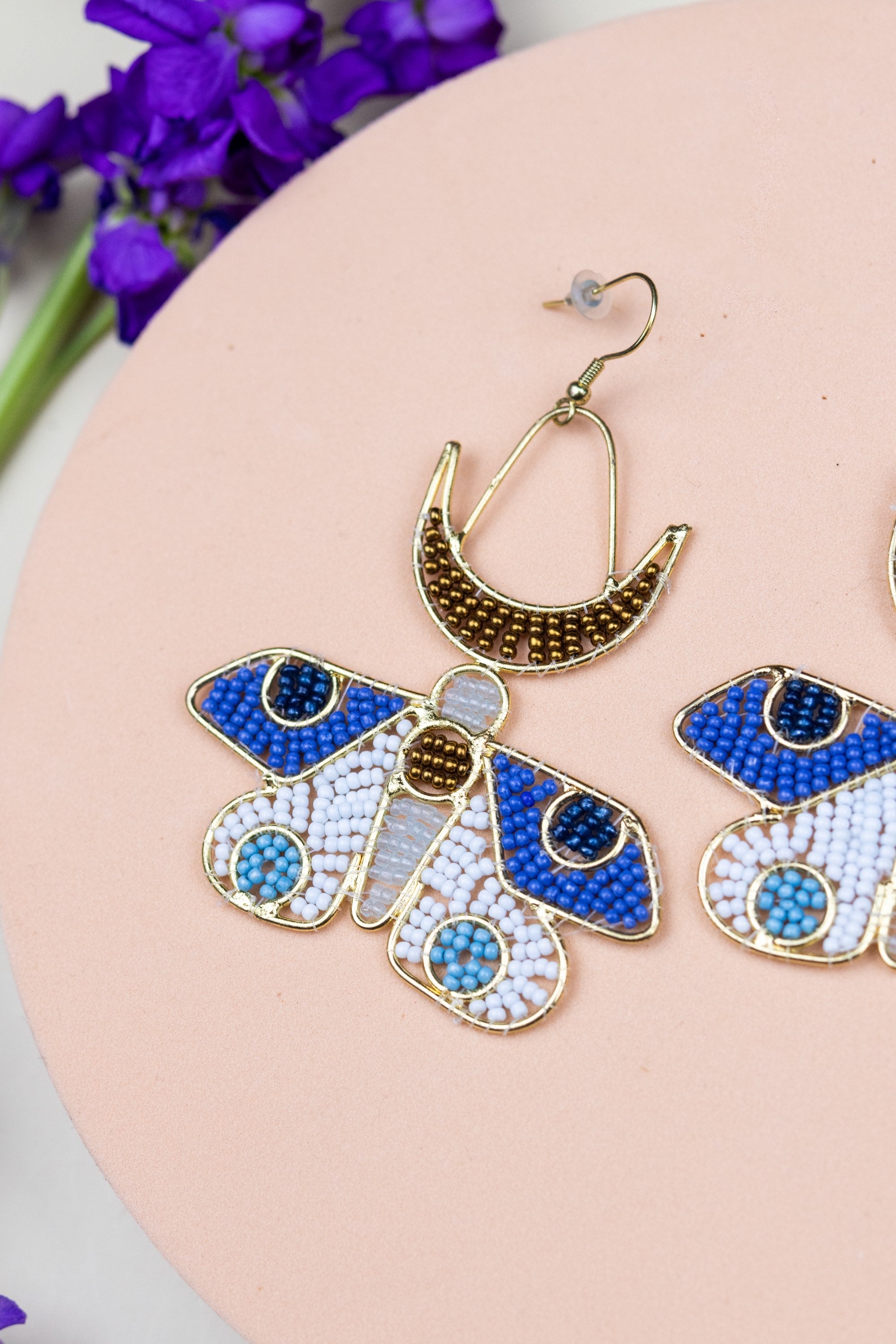 Midnight Moon & Moth earrings capture the quiet magic of nightfall in a pair of sculpted, beaded wings. Each earring is handcrafted with intricate beadwork in soft blues and deep midnight tones, echoing the delicate gradients of a moth in moonlight. Lightweight and expressive, they blend whimsy with elegance, creating a bold yet graceful statement for everyday wear or special moments.