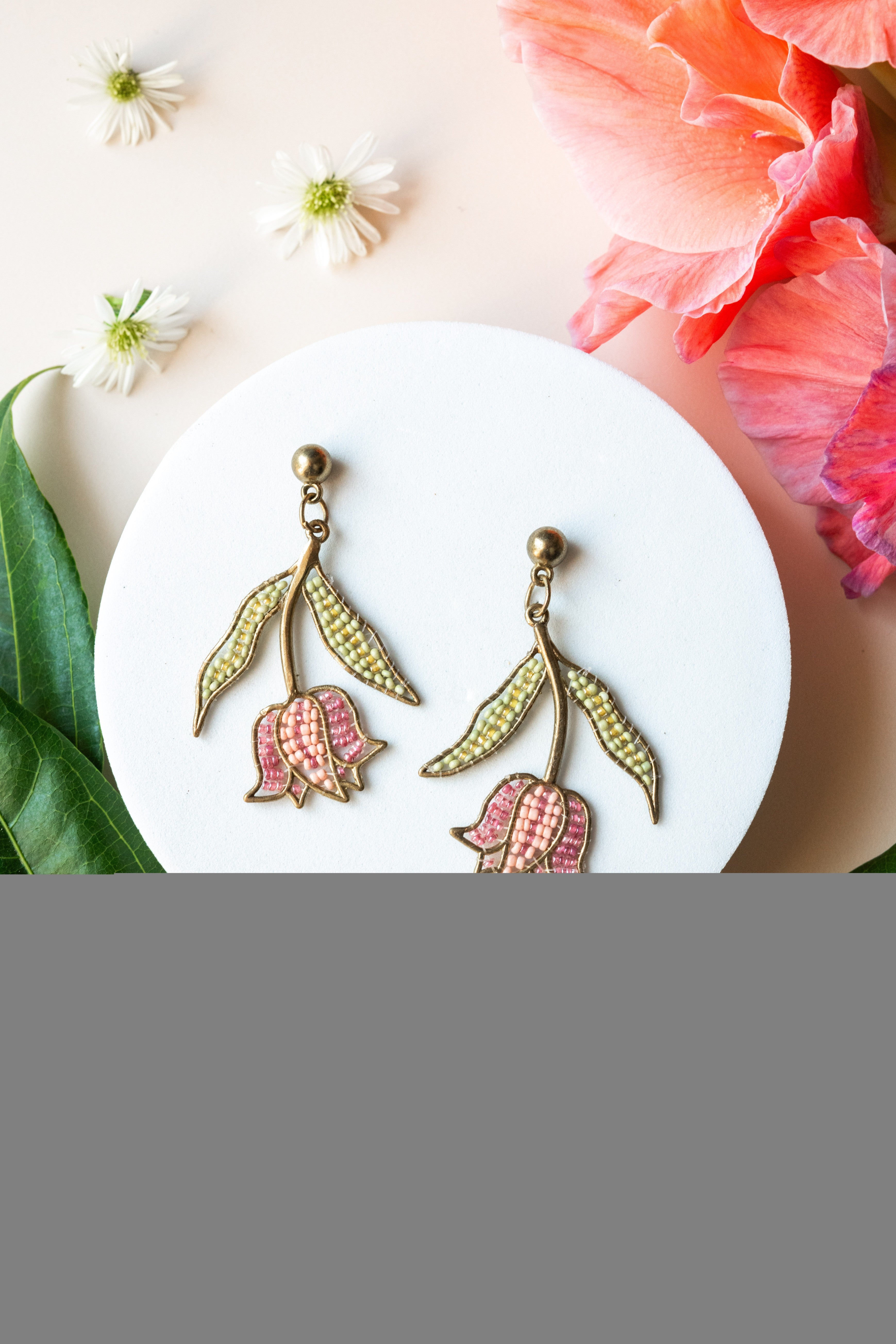 Pair of earrings on a white plate with flowers and leaves around