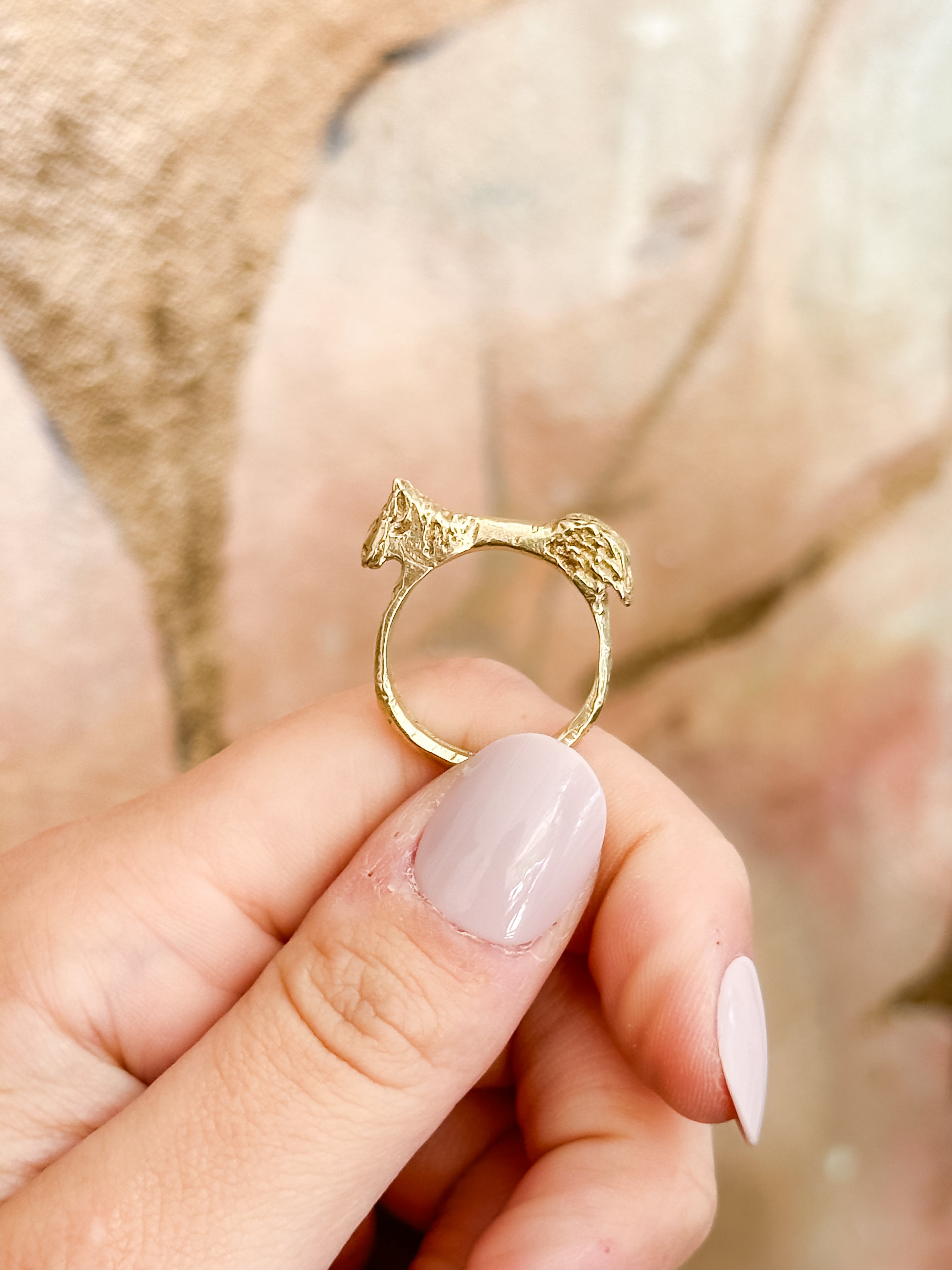 The Wild Mare Ring captures the spirit of an untamed horse in a sculptural, bronze-brass silhouette. Every curve and detail evokes motion, strength, and myth, giving the piece the feel of something discovered in a sun-warmed field or an ancient shrine.